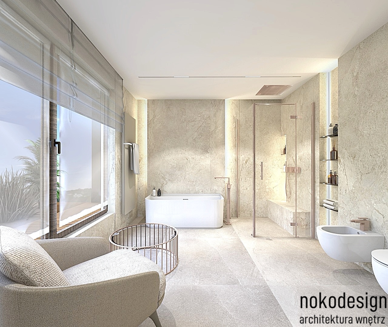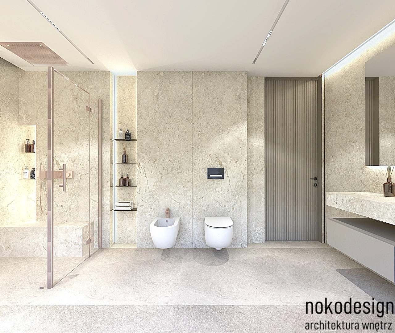 Nowoczesna łazienka w apartamencie stanowi doskonałe uzupełnienie całej aranżacji. Na ścianach i podłodze zastosowano wielkoformatowe płytki imitujące naturalny kamień, które nadają wnętrzu elegancji, a jednocześnie przytulności. Co istotne, neutralna paleta barw – beże, szarości i jasne tonacje – podkreśla lekkość przestrzeni.