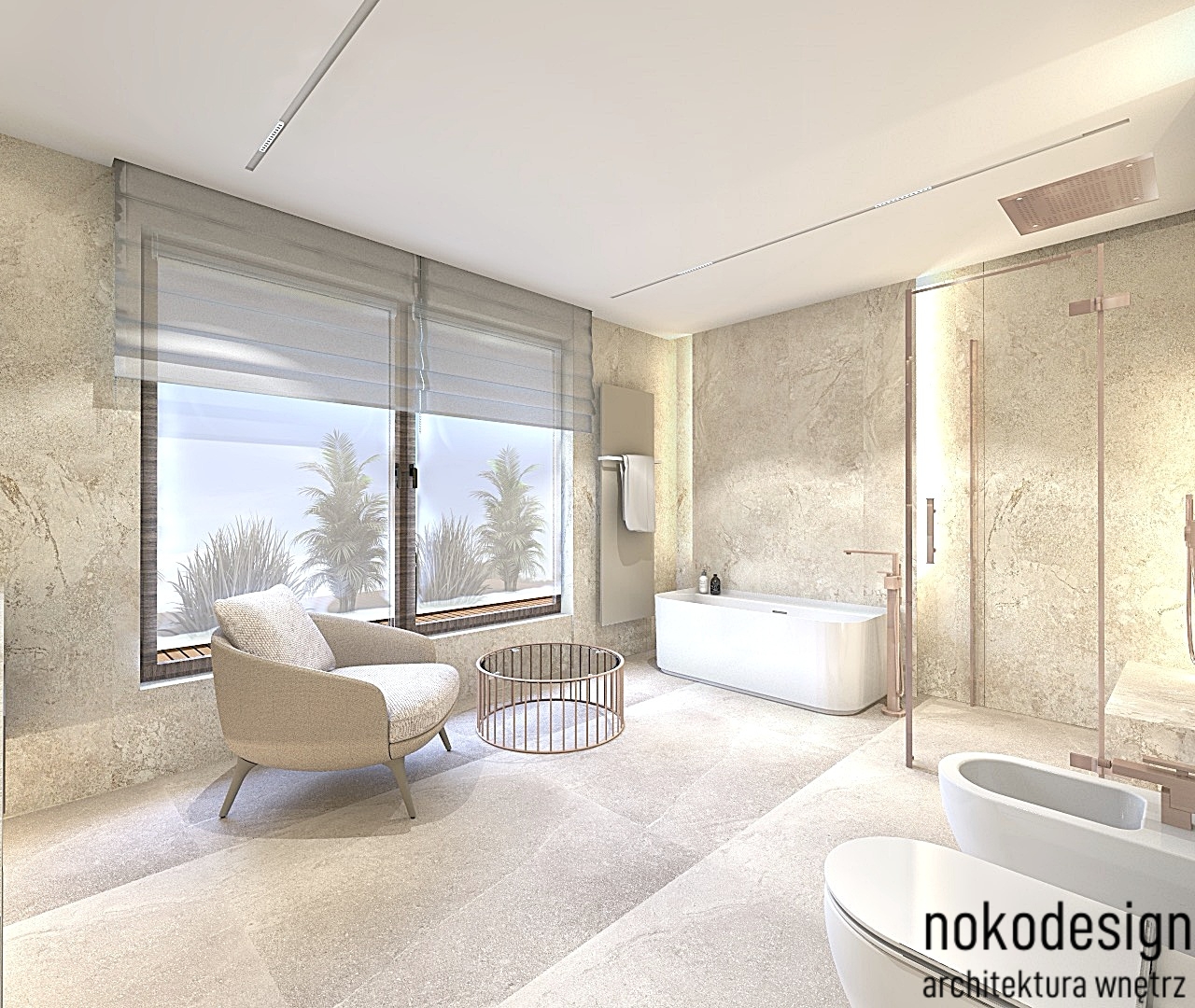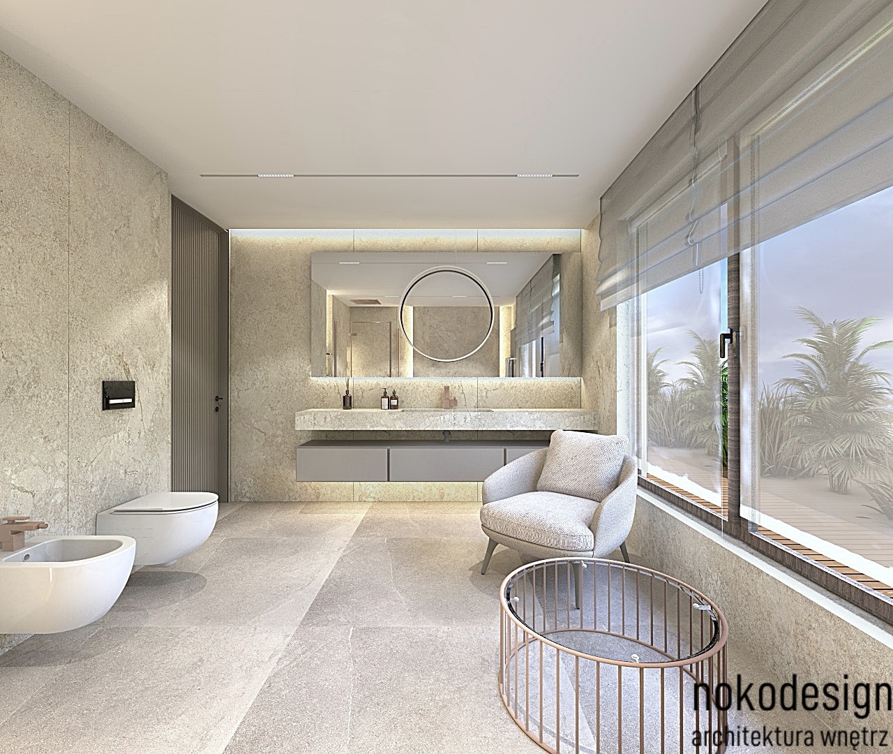 Dodatkowo oświetlenie LED wokół lustra oraz pod blatem tworzy miękkie, rozproszone światło. Dzięki temu wnętrze zyskuje głębię i sprzyja relaksowi. Naturalne światło wpadające przez duże okna jeszcze bardziej podkreśla nowoczesny charakter łazienki.
