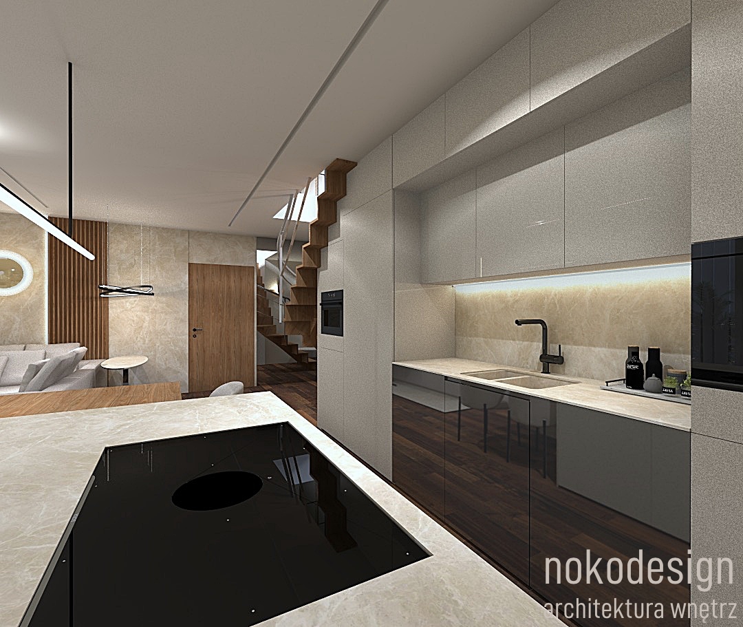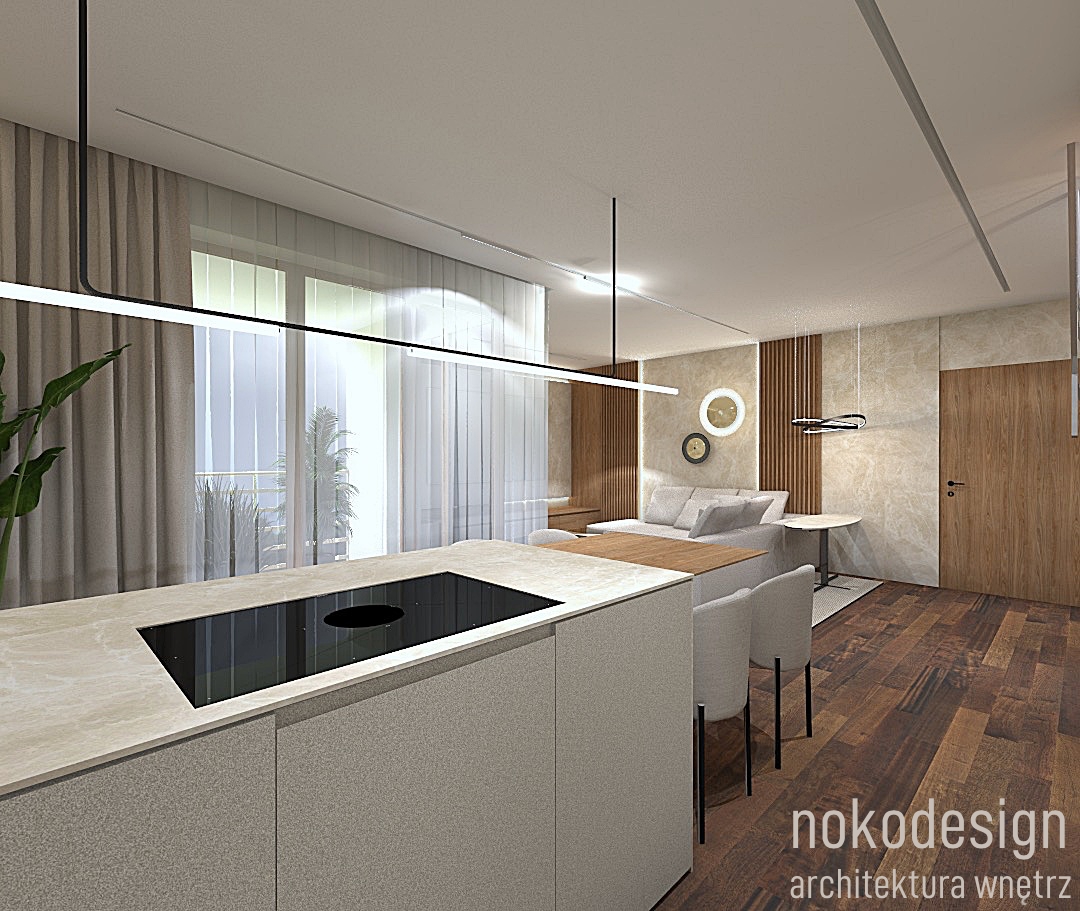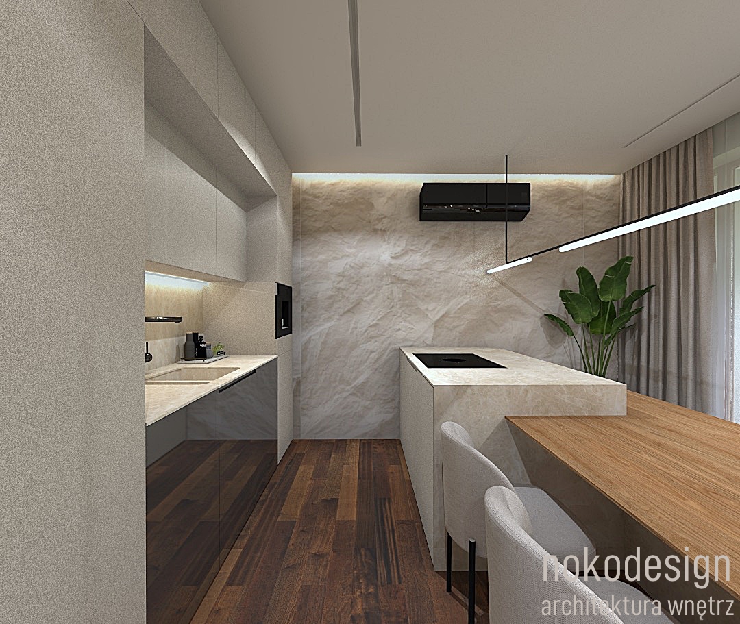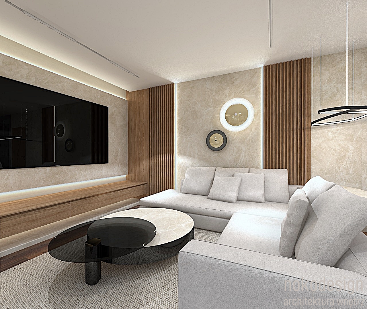Aranżacja nowoczesnego apartamentu opiera się na jasnych, neutralnych barwach. Przede wszystkim dominują odcienie beżu, bieli oraz naturalnego drewna, które optycznie powiększają przestrzeń. Dodatkowo na ścianach zastosowano wielkoformatowe płyty imitujące marmur, dzięki czemu wnętrze zyskuje elegancki i luksusowy charakter.