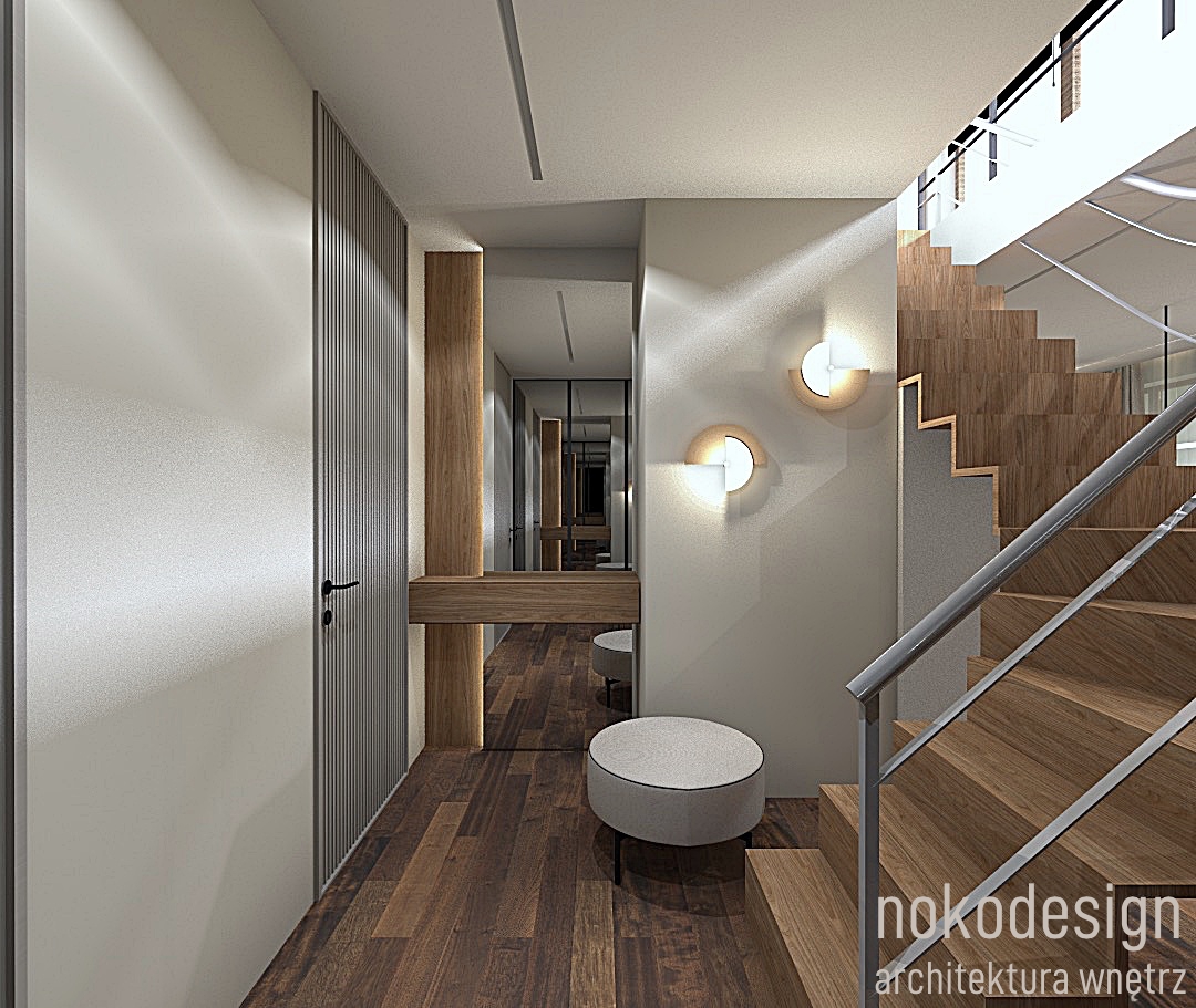 Ponadto oświetlenie LED wbudowane w sufit oraz przy ścianach podkreśla nowoczesność projektu i nadaje wnętrzu przytulnego klimatu. Minimalistyczne formy, takie jak okrągłe lampy ścienne, proste panele oraz geometryczne meble, wprowadzają porządek i wizualną harmonię.
