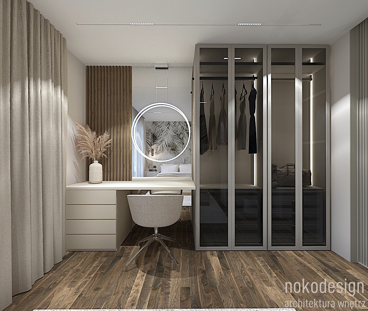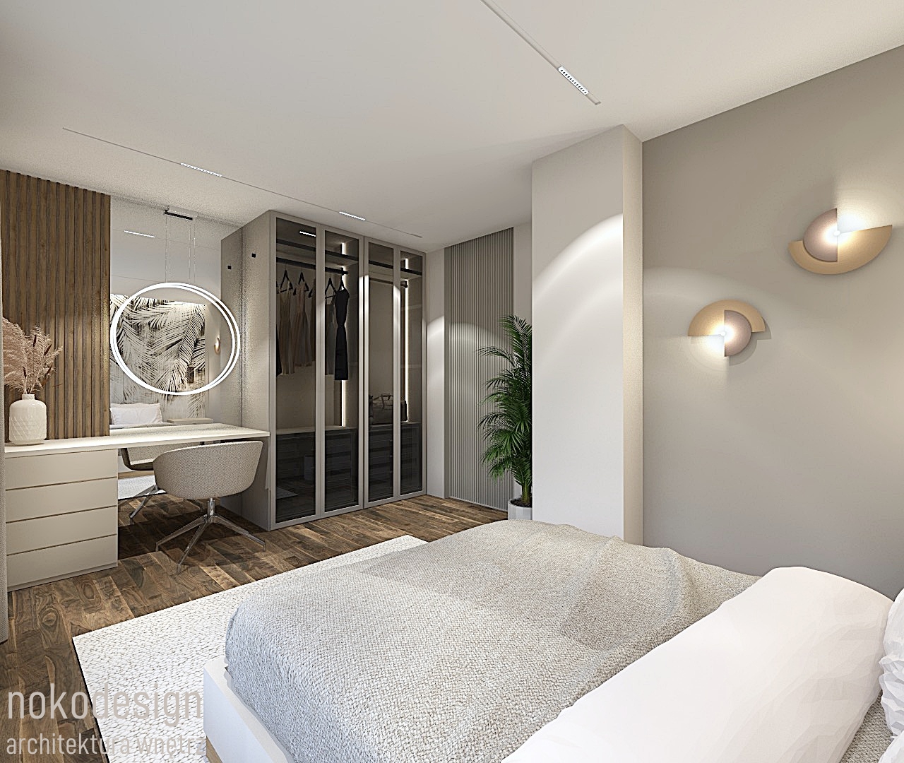 Ponadto wiszące lampy po bokach łóżka oraz okrągłe oświetlenie lustra nad toaletką nadają wnętrzu lekkości i podkreślają jego geometryczny porządek. Istotnym elementem aranżacji są również drzwi ryflowane, których pionowe żłobienia wprowadzają nowoczesność i subtelną strukturę.