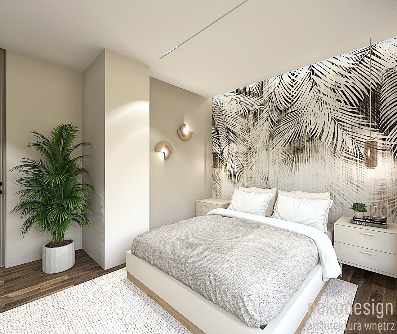 Nowoczesna sypialnia została zaprojektowana jako przestrzeń sprzyjająca wyciszeniu i regeneracji. Główna ściana za łóżkiem wyróżnia się tapetą z motywem roślinnym, która wprowadza delikatny klimat boho i naturalną harmonię. Jednocześnie boczne ściany pozostają stonowane, co pozwala wyeksponować detale.
