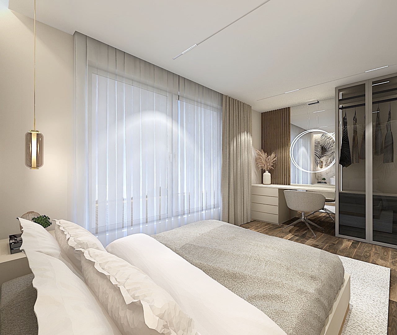 Nowoczesne wnętrza apartamentu zostały zaprojektowane z myślą o połączeniu funkcjonalności, estetyki oraz naturalnych materiałów. Już od pierwszego wejścia przestrzeń zachwyca jasną kolorystyką, spójną aranżacją oraz eleganckimi detalami, które tworzą harmonijne i komfortowe miejsce do życia. Co więcej, zastosowane rozwiązania sprzyjają codziennemu relaksowi i podkreślają nowoczesny charakter apartamentu.